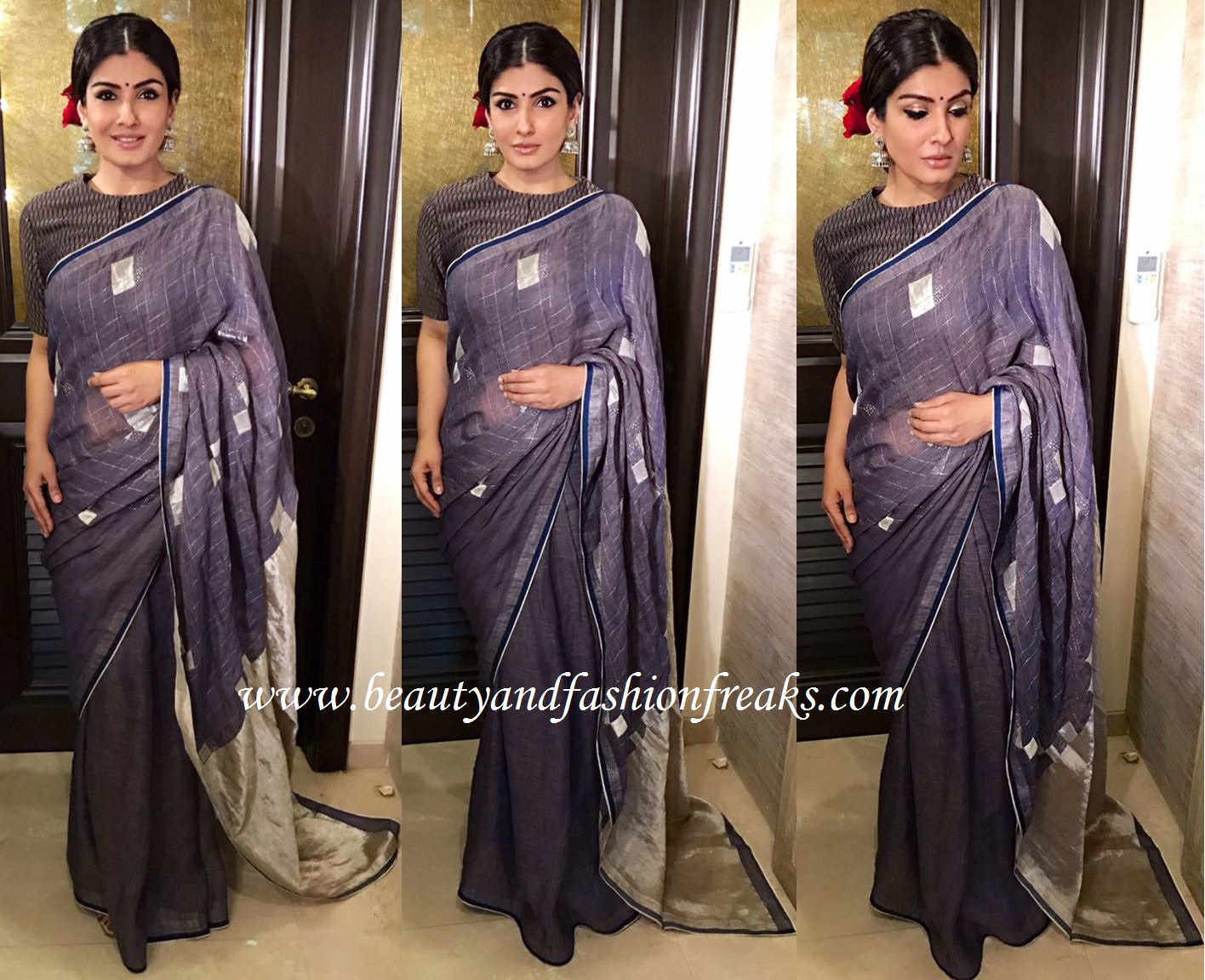 Wearing an Anavila sari, Raveena attended an Excise Day event in Mumbai. Middle parted hair in an updo with red flowers, Amrapali jewellery, a bindi and a pair of metallic sandals completed the look for her. Wish she kept the pallu a little short, barring which the former actor looked fantastic!
