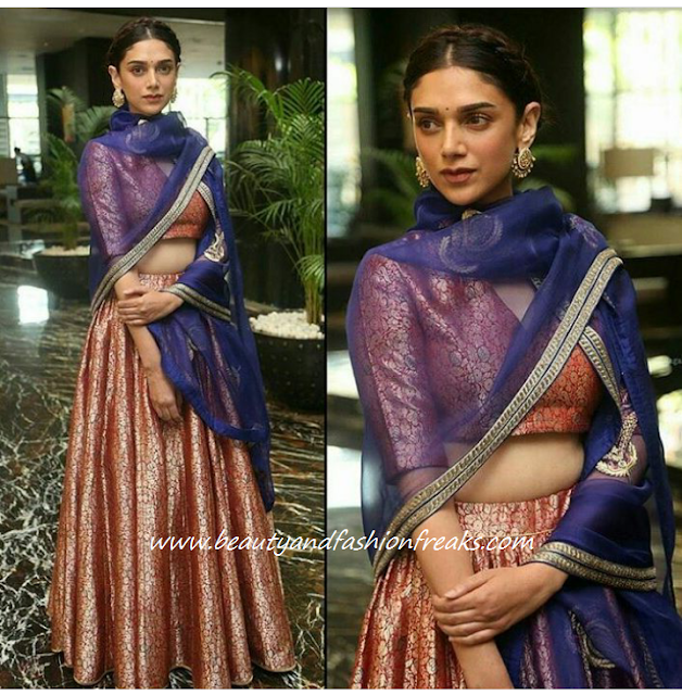 The audio launch of her upcoming movie in Hyderabad saw Aditi in a Raw Mango lehenga. With her hair in a milkmaid braid, she rounded out the look with a pair of statement earrings. Loved the old world charm of this look, the actor looked so elegant and royal!