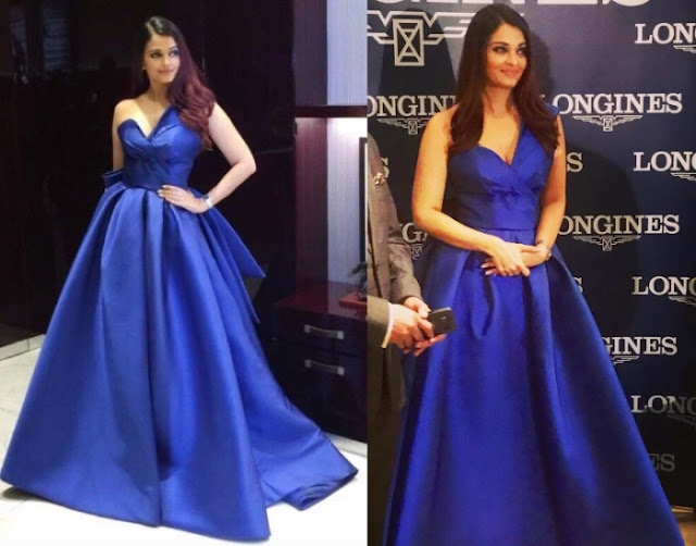 It was a blue one-shouldered Mark Bumgarner gown for Aishwarya while at a Longines event in Dubai. Nothing unique or new about the gown but Ms. Rai surely wore it well and the color looked great on her!