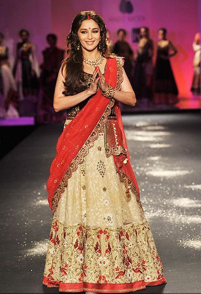 In an another look in which madhuri was spotted earlier was a show of designer Anju Modi Wearing a cream embroidered lehenga, black blouse and red muslin dupatta,  Madhuri Dixit transformed into a devi for designer Anju Modi’s Bengal-inspired collection at the PCJ Delhi Couture week on Day 3 July 2012.