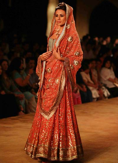 I like this lehnga which portrays the combination of orange, bronze, blue, red and gold. Blue jewelry complements it well.