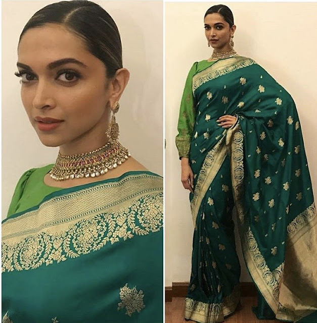 The Social Summit Awards in Vijayawada yesterday saw Deepika sporting a label Sailesh Singhania green hand-woven silk saree and blouse. Hair in a bun and some exquisite jewelry rounded out the look for her. A very unconventional yet impactful look! Make-up and styling was spot on, the actor looked royal!