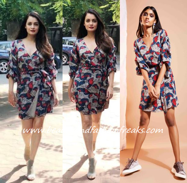 Dia was recently photographed wearing a Ritika Bharwani printed wrap mini dress for a shoot. With her side parted hair down, she completed the look with dark lips and a pair of ankle-length peep-toe grey boots. Nothing much to fault here, Ms. Mirza wore her mini well!