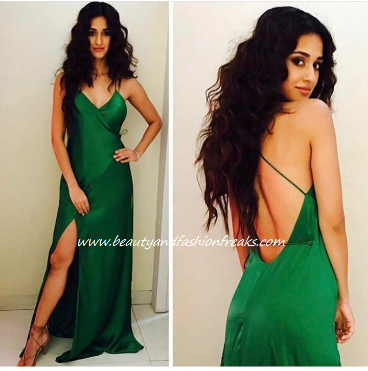 It was an emerald green Michelle Mason silk maxi for Disha for unveiling her mobile app in Mumbai recently. A pair of tan Intoto sandals was what all that it took to finish out the look for her. Can’t say I was a fan of the dress but the color surely looked good on her!