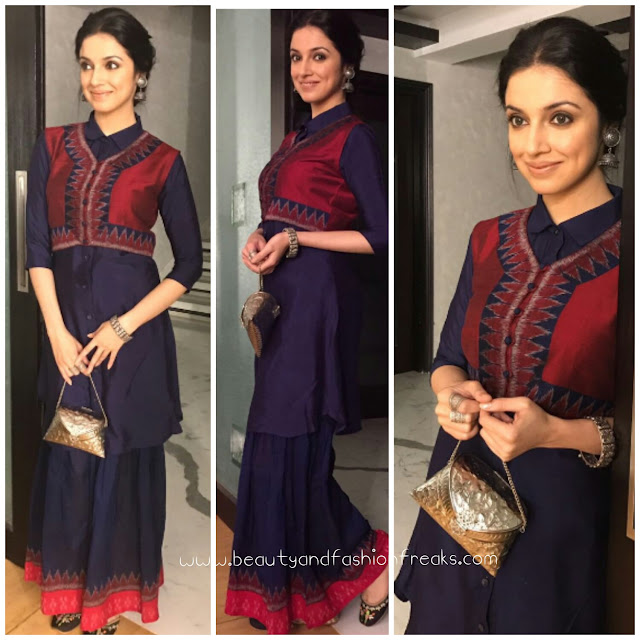It was a navy Mint Blush outfit for Divya for attending the Dangal success bash held recently. Wearing her hair in an updo, she rounded out her look with a pair of Fizzy Goblet jootis, Sangeeta Boochra jhumkis and an Accessorize by Anandita silver bag. The outfit is lovely and Ms. Kumar wore it with such grace and elegance, she looked gorgeous!