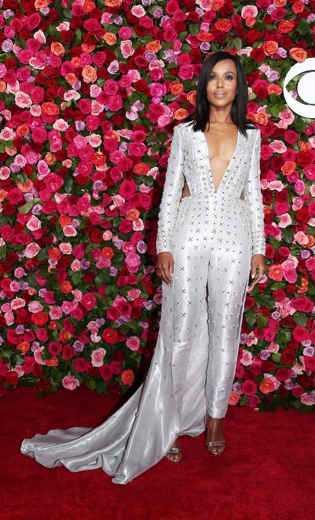 Kerry Washington was seen wearing Christian Louboutin heels with an embellished silver jumpsuit by Atelier Versace Couture at Tony Awards this week. Her jumpsuit was accompanied with a matching cape, open hair and nude lips. This heroic gown makes Kerry one of the best dressed Hollywood celebrities this week. What say?