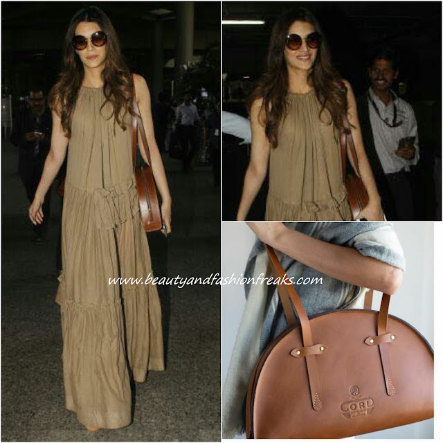 Kriti was recently photographed at the Mumbai airport wearing a brown Chola maxi. Wearing her hair down, she rounded out her airport look with a Cord half-moon shoulder bag and sunglasses. Major love for the bag and it was certainly the right pick for the dress. Ms. Sanon looked great!