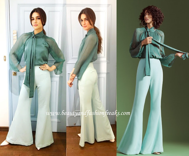 Badrinath Ki Dulhania success bash saw Kriti sporting a bow blouse with mint blue pants, both from Lola By Suman B. With her hair in a low ponytail, a pair of white pumps was all that it took to finish out the look for her. Unusual color combinations are always a treat to watch and Ms. Sanon is completely making this teal green and mint blue combo work. She looked damn good!