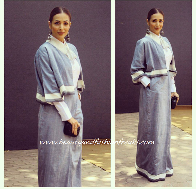 Malaika sported a fresh off the AIFW runway pre-stitched sari with a matching bolero jacket by the designer duo Abraham & Thakore for inaugurating a beauty show in Mumbai. Hair in a sleek centre-parted ponytail, a pair of silver earrings and a black clutch rounded out the look for her. Well can’t say I am a fan of the outfit here and it is not an easy look to pull off but Ms. Arora surely worked it well!