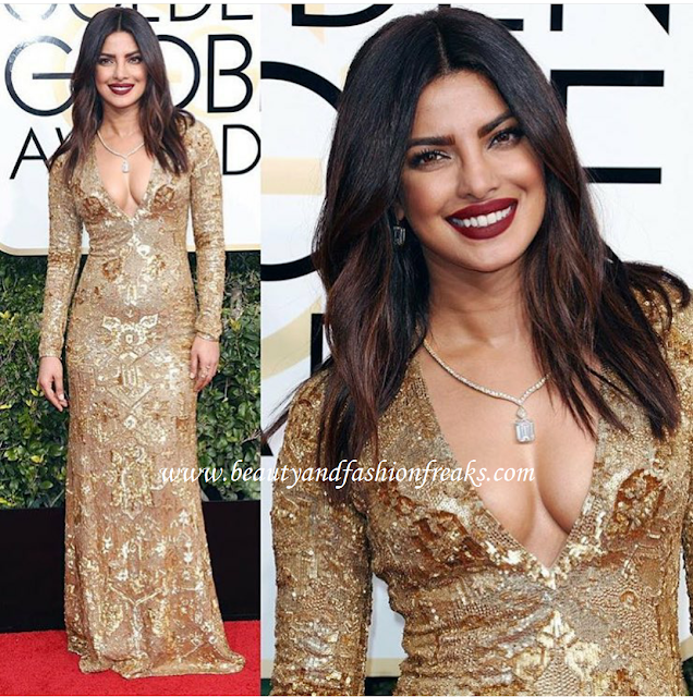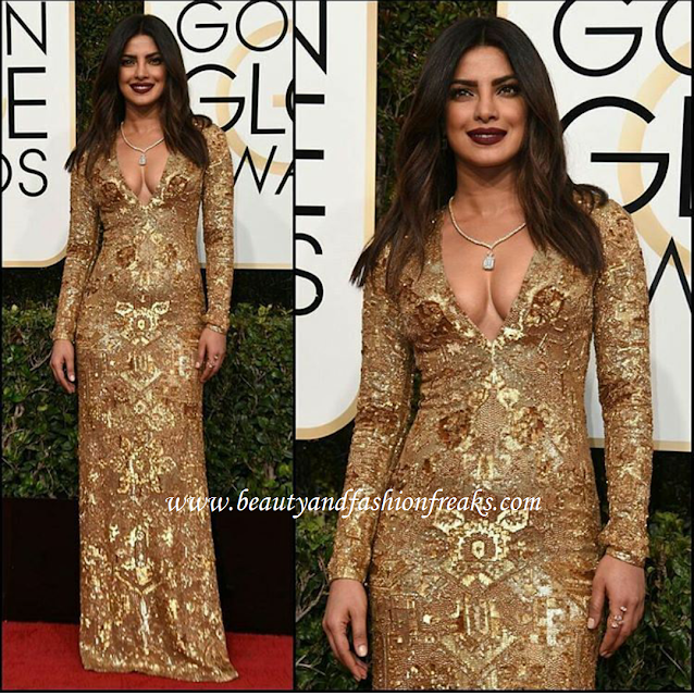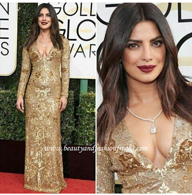 It was a sequin Ralph Lauren gown for Priyanka for walking the red carpet of the Golden Globes 2017. Simple hair, a Lorraine Schwartz necklace and oxblood lip completed the look for her. The make-up and hair were fabulous, no complaints there! But can’t say I was a fan of the gown itself. Not only was it too snug, its way too much gold to handle! PC can surely do much better than this!