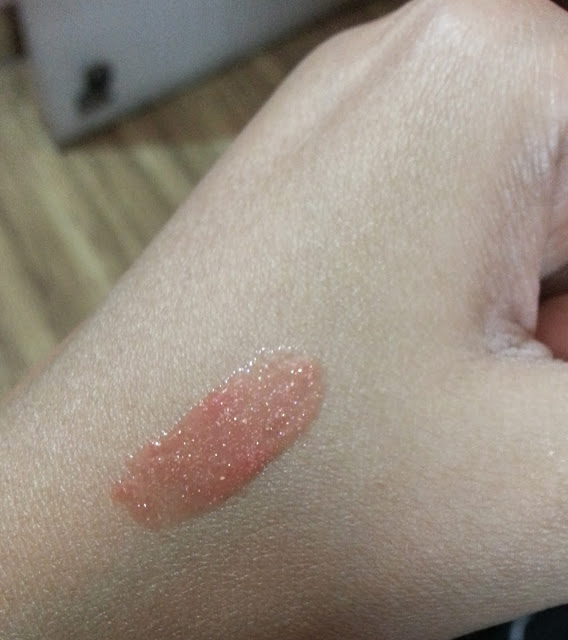 I like the control and precision of the applicator. The gloss has mild and fruity fragrance which I found good. The texture of the gloss is thick, smooth but a bit sticky. It is a peachy brown shade that contains golden sparkles.