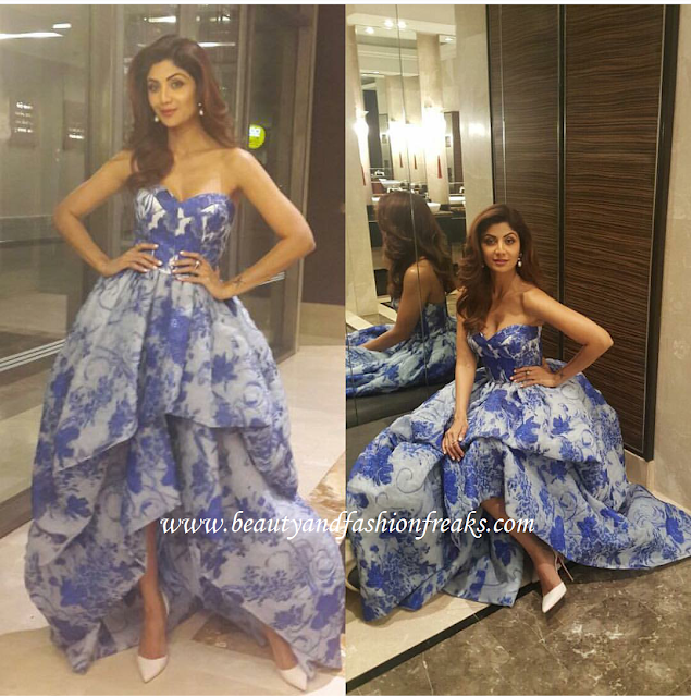 It was a strapless gown by Yolan Cris for Shilpa for attending the recently held Femina Beauty Awards. Wearing her side parted hair down, Ms. Shetty rounded out her look with a pair of earrings and white Louboutins. Wish she opted for pink lips here, barring this minor grip she looked fantastic!
