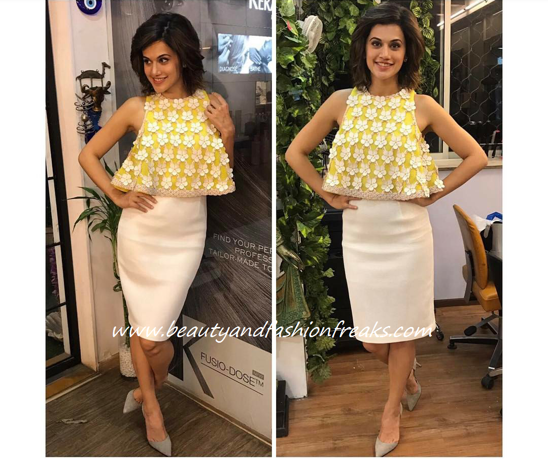 Taapse opted for a yellow flared top with a white pencil skirt, both by the designer duo Pankaj & Nidhi while at the screening of her movie Naam Shabana. A pair of grey pumps was all that it took to finish out the look for her. Loved that cheery top on Ms. Pannu, the actor looked uber chic!