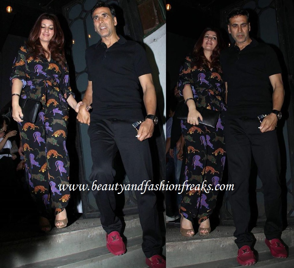 The lovely couple, Twinkle and Akshay were photographed in Mumbai yesterday while celebrating Valentines with close friends. While Mr. Khiladi was wearing all black with red shoes, Mrs. Khiladi sported a printed jumpsuit by Stella McCartney with black Hermès Jige clutch and golden heels. Mrs. Funny Bones made the busy print work for her, she looked good!