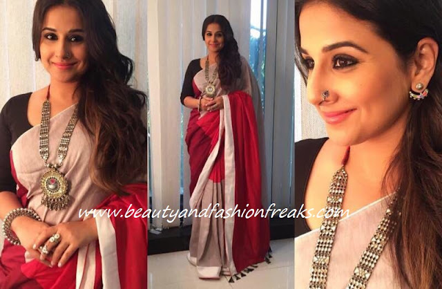 Vidya opted for a sari by Udd for promoting her upcoming movie Begum Jaan at an event held in Mumbai recently. Wearing her hair swept to the side, she completed the look with jewellery from Aadyaa, Amrapali and Silver Streak. The look doesn’t have anything new to offer but that is not to take anything away from the fact that the actor looked nice here!