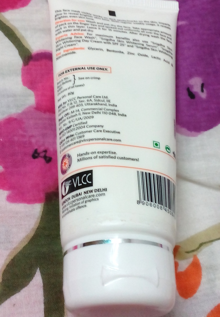 KEY INGREDIENTS of VLCC natural sciences SNIGDHA SKIN WHITENING FACE MASK – Glycerin, bentonite, zinc oxide, lactic acid