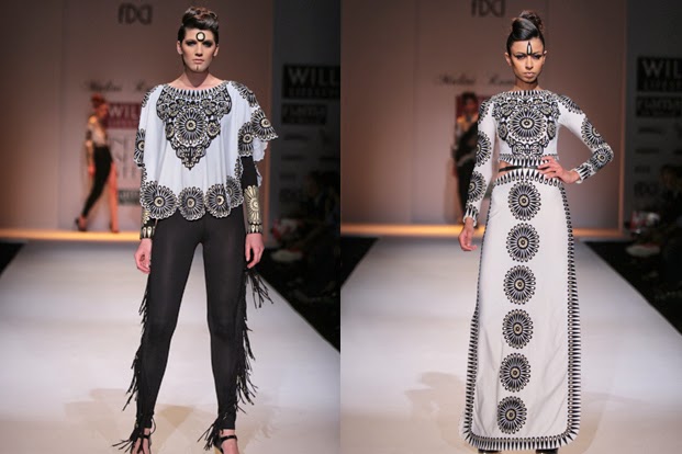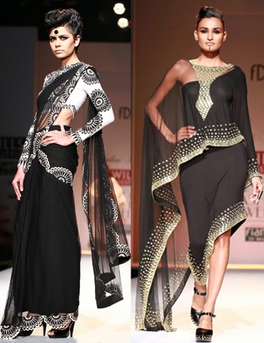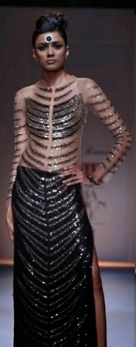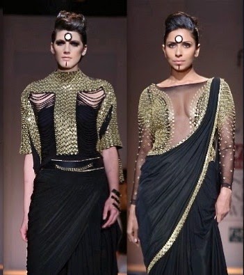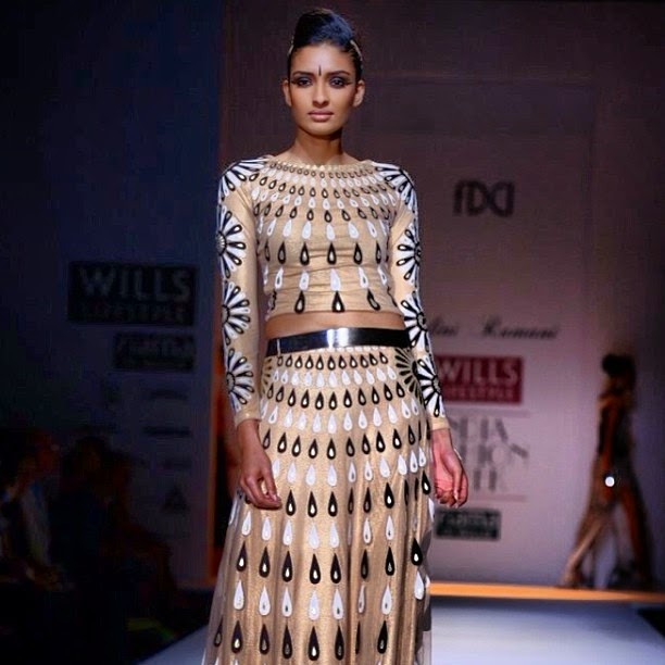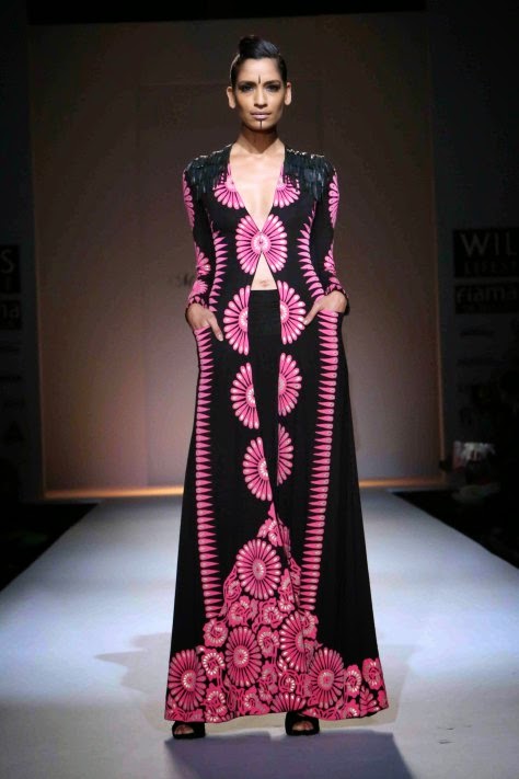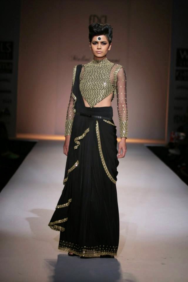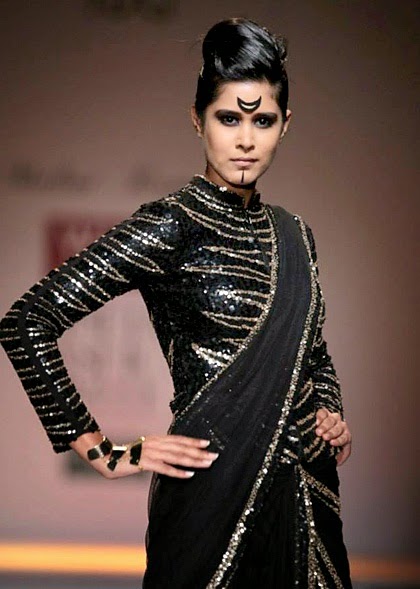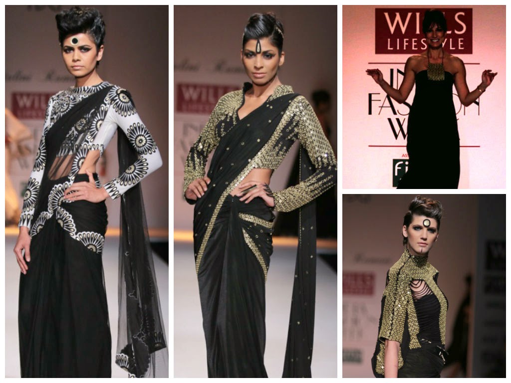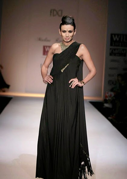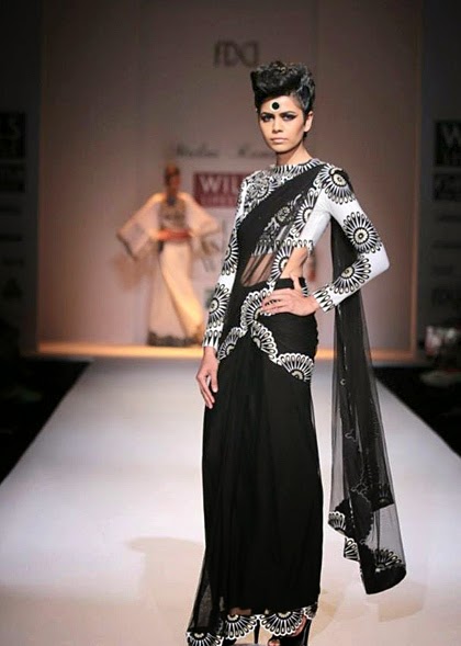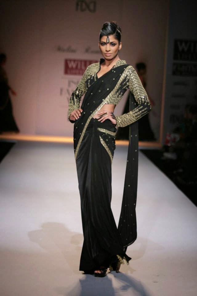 Malini Ramani Collection at Wills Lifestyle India Fashion Week (WIFW) Autumn Winter 2014 was titled Glamourette. She was at her best this time and decided to go the Indian way for her autumn-winter collection. Her collection was dominated by sarees, though there were figure hugging dresses and thigh high slits too. What enhanced the Indian look was the use of bindis on foreheads and the winged eye makeup which reminded me of yesteryears bollywood heroines.